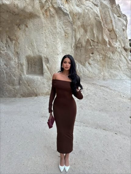 Kadın Uzun Kollu V Yakalı Yandan Yırtmaçlı Iki Iplik Midi Elbise