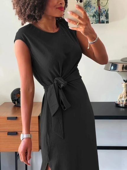 ₺500,00Kadın Kısa Kollu Yuvarlak Yaka Belden Bağcıklı önden Yırtmaçlı Aerobin Elbise