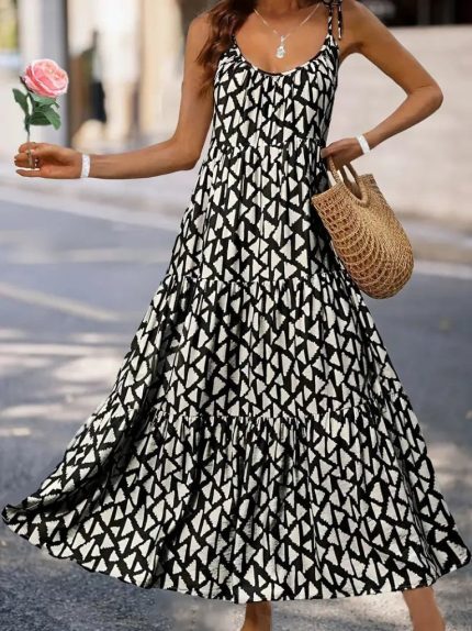 Kadın Askılı Yuvarlak Yaka Fırfırlı Desenli Uzun Bürümcük Elbise