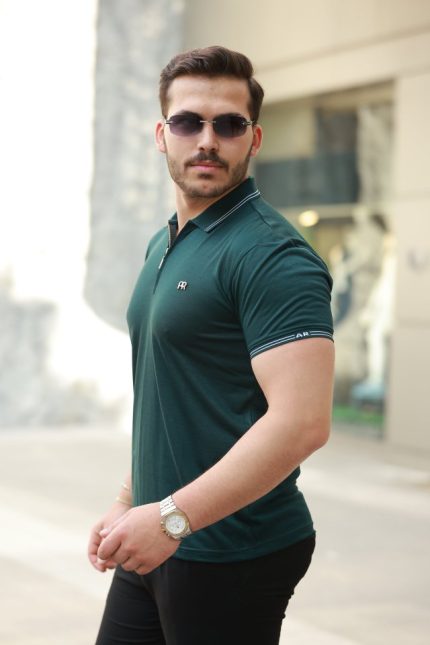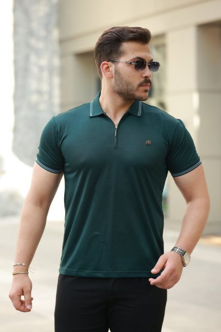 Erkek Yaka Ve Kolları çizgi Detaylı Fermuar Yakalı Kısa Kollu Tişört