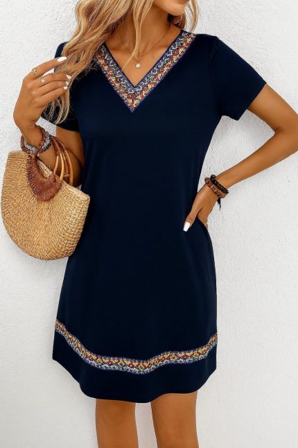 Kadın Kısa Kollu V Yakalı Etnik Desen şerit Detaylı Viskon Elbise