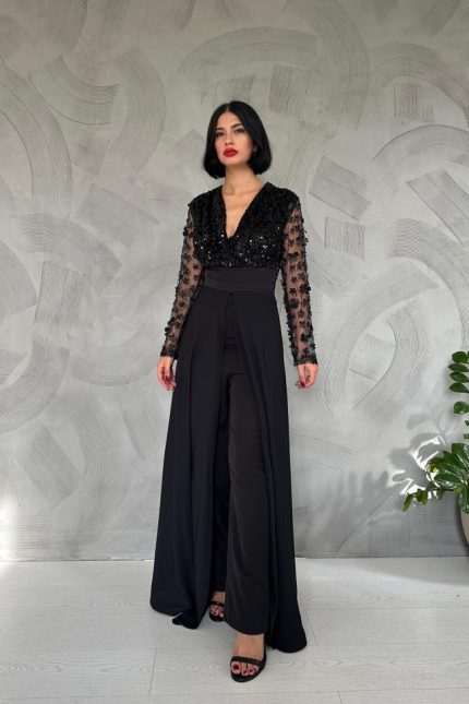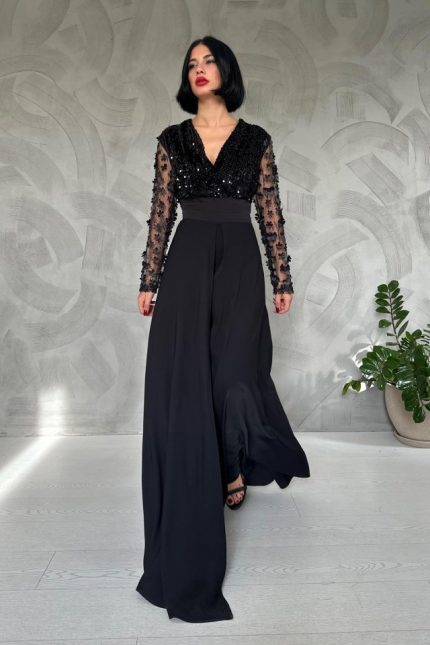 Kadın Uzun V Yakalı önden Pulpayet Detaylı Tüllü Uzun Ithal Krep Tulum