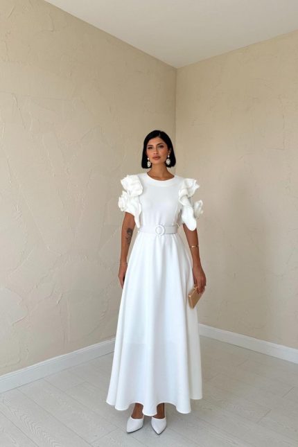 Kadın Omuz Dekolteli Arkası Büzgü Detay Midi Boy Elbise