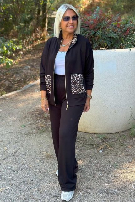 Kadın Bisiklet Yaka Kısa Kol Leopar Desen Bluz Ve Pantolon Ikili Takım