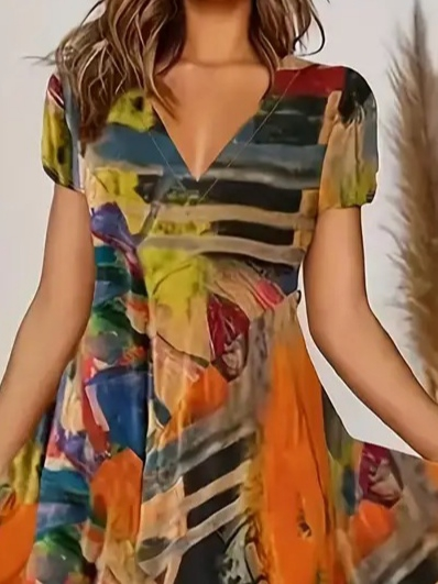 Kadın Kısa Kollu V Yaka Renkli Karışık Desen Kloş Süprem Midi Elbise