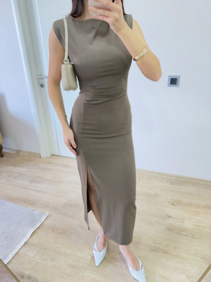 Kadın Askılı Geniş V Yakalı Sırttan Bağlamalı Yırtmaçlı Süprem Elbise
