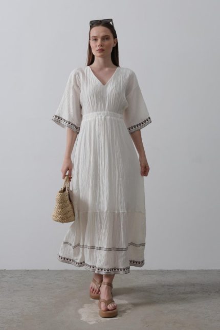 Kadın Kısa Kollu Yuvarlak Yaka Damla Detaylı Janjan Elbise