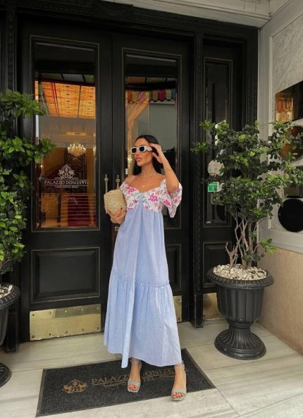 RENKLİ NAKIŞ DESENLİ ELBİSE – Mavi