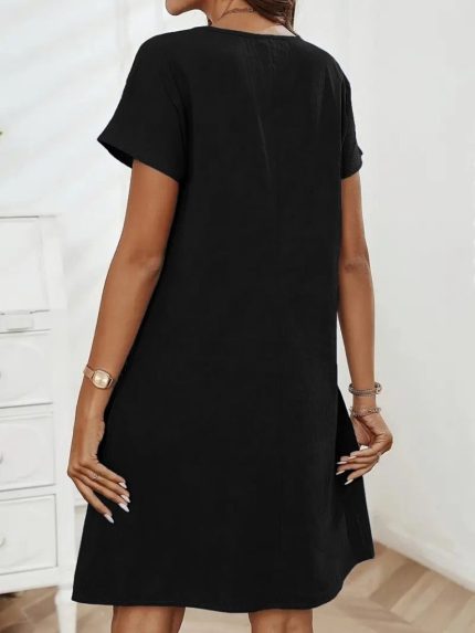 Kadın Kısa Kollu Yakası Açık Fermuarlı Cep Detaylı Ithal Keten Elbise