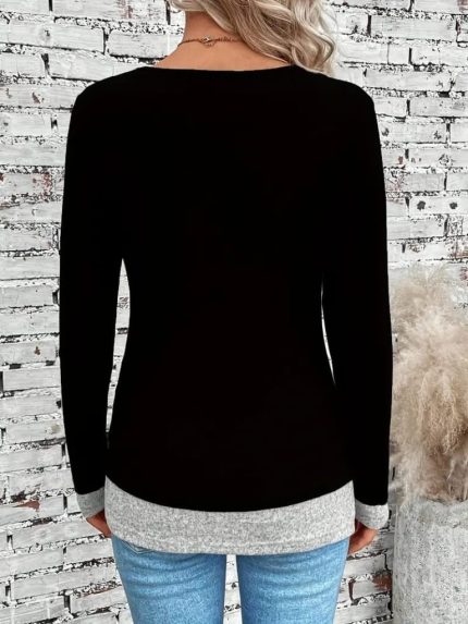 Kadın Uzun Kollu Yuvarlak Yaka Blok Renkli Yandan Düğmeli Viskon Bluz
