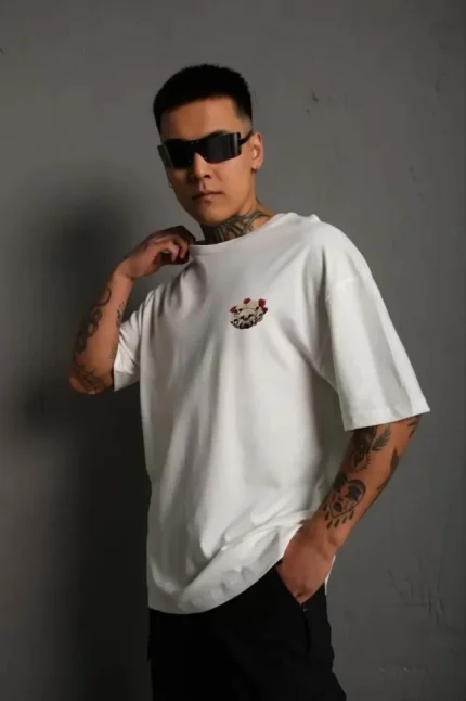 Unisex Bisiklet Yaka Baskılı Oversize T-Shirt – Beyaz