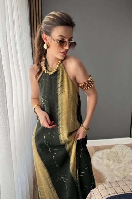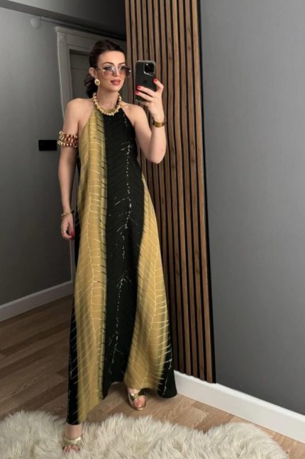 Kadın Omuz Askılı Kuş Gözü Zincir Detay Sandy Kumaş Maxi Boy Elbise