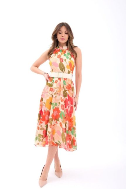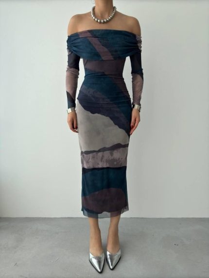 Kadın Ip Askılı Dekolteli Bağcıklı Yırtmaçlı Desenli Süprem Elbise