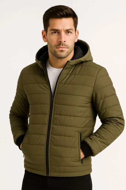 Erkek Şişme Kapüşonlu Fermuarlı Mont Su Itici Kapitone Astarlı Kumaş Cepli Kışlık Rahat Kalıp – Haki