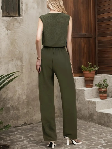 Kadın Kolsuz V Yakalı Aerobin Bluz Ve Belden Kuşaklı Pantolon Ikili Takım