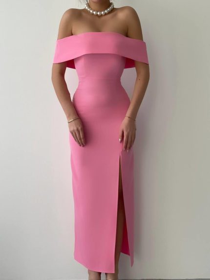 Kadın Kısa Kollu Derin Dekolte V Yakalı Yırtmaçlı Midi Janjan Krep Elbise
