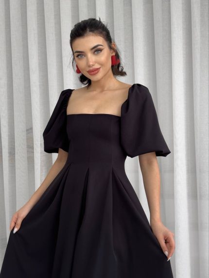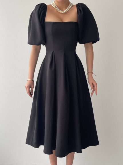 Kadın Kısa Balon Kollu Bisiklet Yaka Geniş Kesim Janjan Krep Elbise