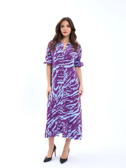 Kadın Kısa Kollu V Yakalı önden Pileli Midi Janjan Krep Elbise