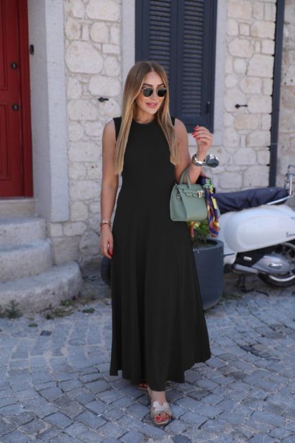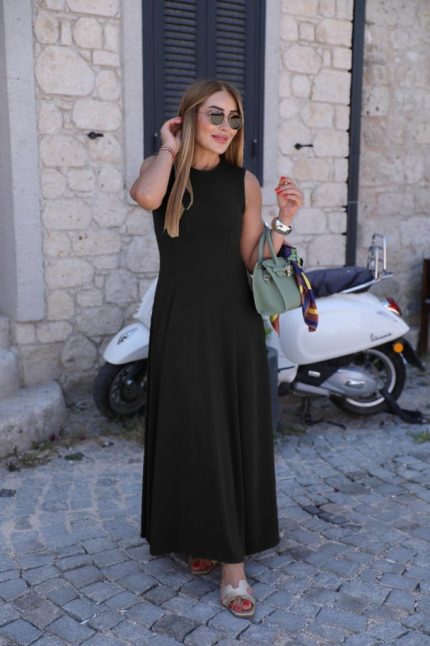 Kadın Sıfır Kol Sıfır Yaka Drape Detaylı Midi Janjan Krep Elbise