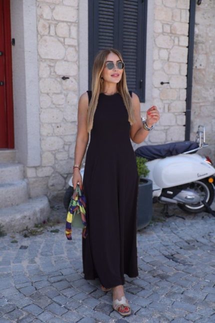 Kadın Kolsuz Sırttan çapraz Ip Detaylı Uzun Viskon Elbise