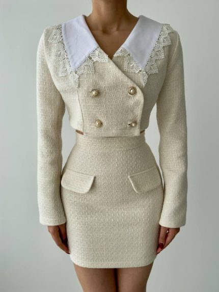 Kadın Uzun Kollu Düşük Omuz Yırtmaç Detay Kaşkorse Etek Bluz Ikili Takım