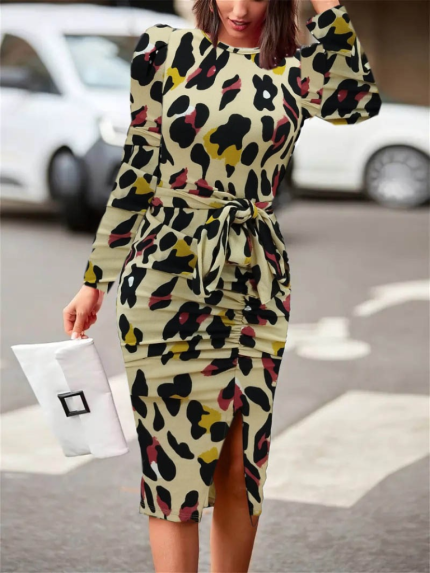 Kadın Uzun Kollu Yuvarlak Yaka Belden Kuşaklı önden Yırtmaçlı örme Krep Elbise