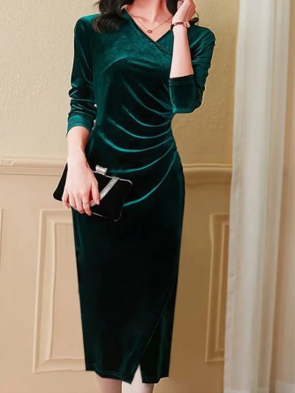 Kadın Uzun Kollu Kruvaze Yakalı Yandan Büzgülü önden çapraz Detaylı Midi Kadife Elbise