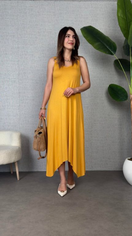 2501 Desenli Sıfır Kol Şifon Elbise – Mavi