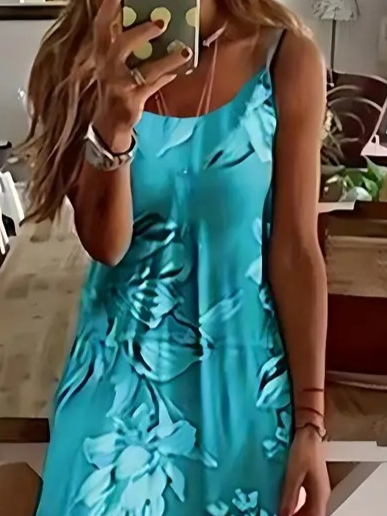 Kadın Askılı Yuvarlak Yaka Etek Geniş Kesim Desenli Süprem Elbise