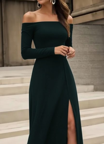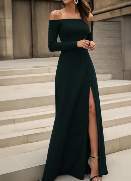Kadın Uzun Kollu Madonna Yakalı Yırtmaç Detaylı Uzun Ithal Krep Elbise