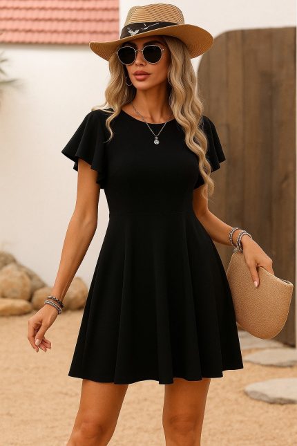 Kadın Uzun Kollu V Yaka Belden Hafif Pileli Scuba Krep Mini Boy Elbise