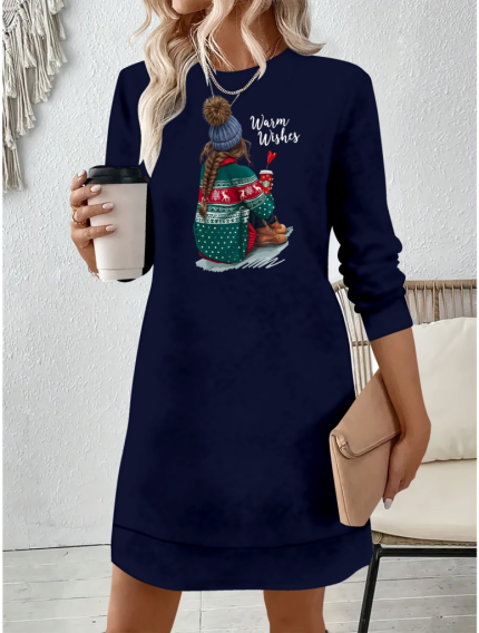 Kadın Uzun Kollu Bisiklet Yaka Desenli Kısa Viskon Iki Iplik Elbise