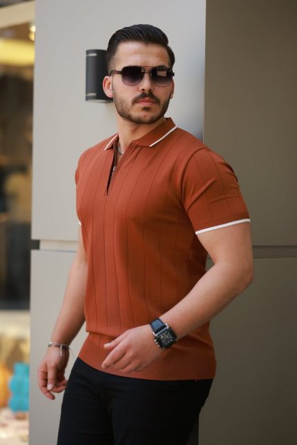 Erkek Fermuar Yakalı çizgi Dokulu Kısa Kollu Tişört