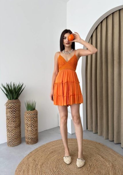 Kadın Kısa Kollu Yakası Açık Katlı Bürümcük Balon Elbise