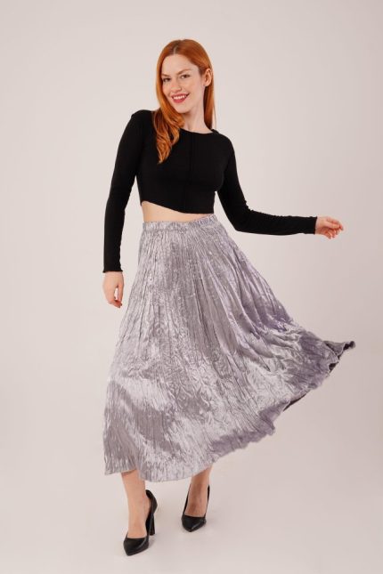 Kadın Uzun Kollu Bot Yaka Yanı Taş Detaylı Midi Kadife Elbise
