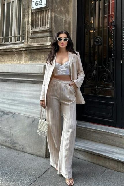 Kadın Paçası Yırtmaç Detaylı Taşlı Bel Bağlamalı Kaşkorse İkili Takım