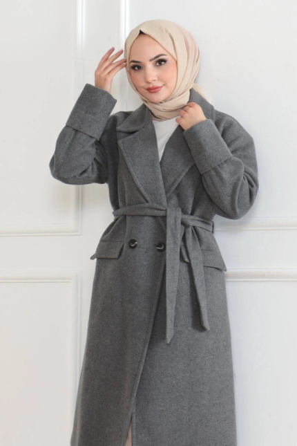 Kaşe Kaban – Uzun Boy Kruvaze Yaka Kuşaklı Tesettür Kaşe Kışlık Kaban, Astarlı Şık Yünlü Dokuma Oversize Rahat Kalıp Cepli Düğmeli Modern Kap Modeli – Gri
