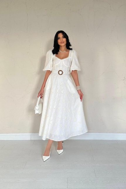 Ekru Göğüs Kup Detaylı Kemerli Brode Elbise