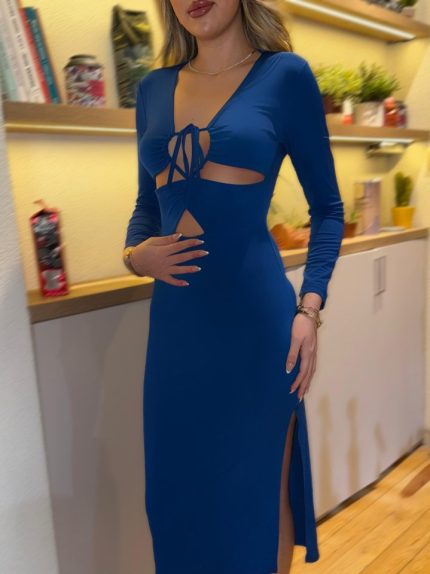 Kadın Uzun Kollu Göğüs Ve Göbek Dekolte Detay Sandy Midi Boy Elbise