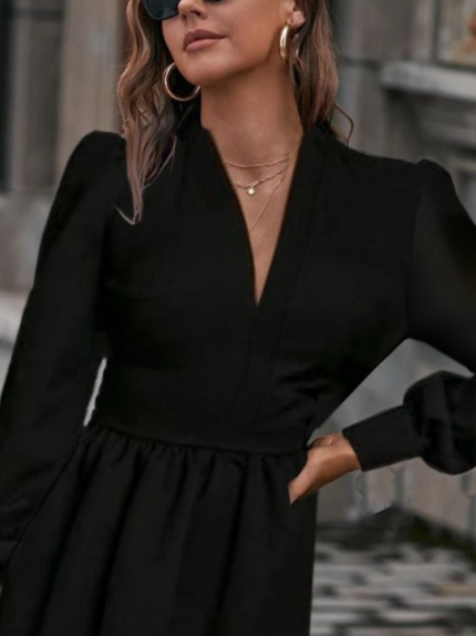 Kadın Uzun Kollu V Yaka Belden Hafif Pileli Scuba Krep Mini Boy Elbise