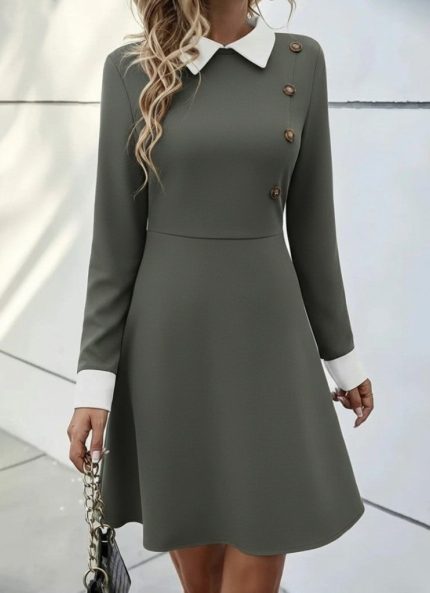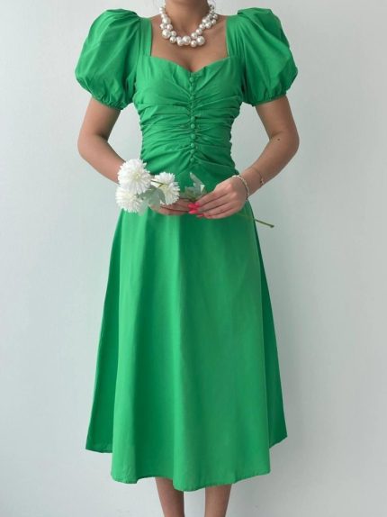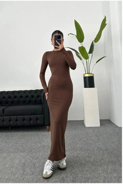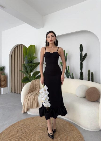 Kadın Uzun Kollu Yarı Balıkçı Yaka Etek Ucu Fırfır Detaylı Midi Ithal Krep Elbise