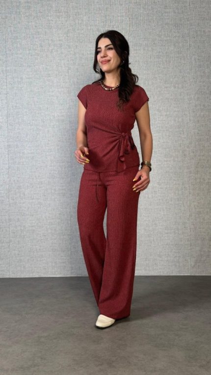 Kadın Kısa Kollu Bisiklet Yaka Yandan Bağlamalı Bürümcük Bluz Ve Pantolon Ikili Takım