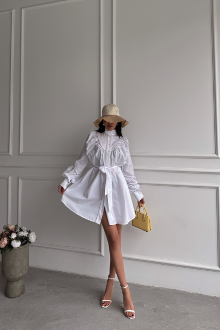 ÖNDEN DÜĞMELİ POPLİN KLOŞ ELBİSE BAĞLAMA KEMER DETAYLI – Beyaz