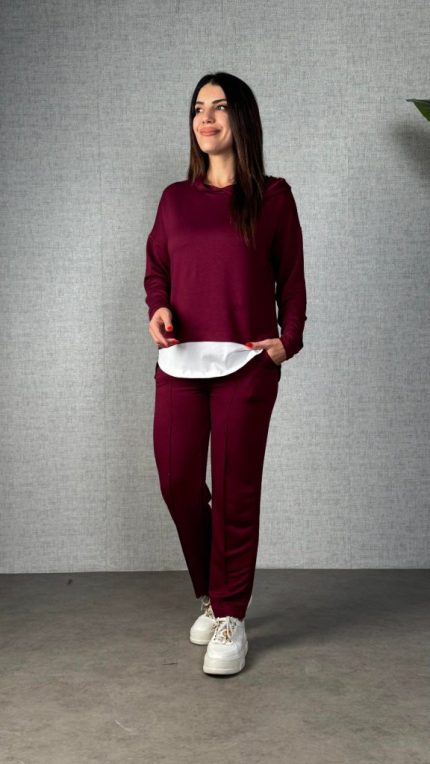 Kadın Uzun Kollu Kapşonlu Bağcıklı Viskon Iki Iplik Bluz Ve Pantolon Ikili Takım