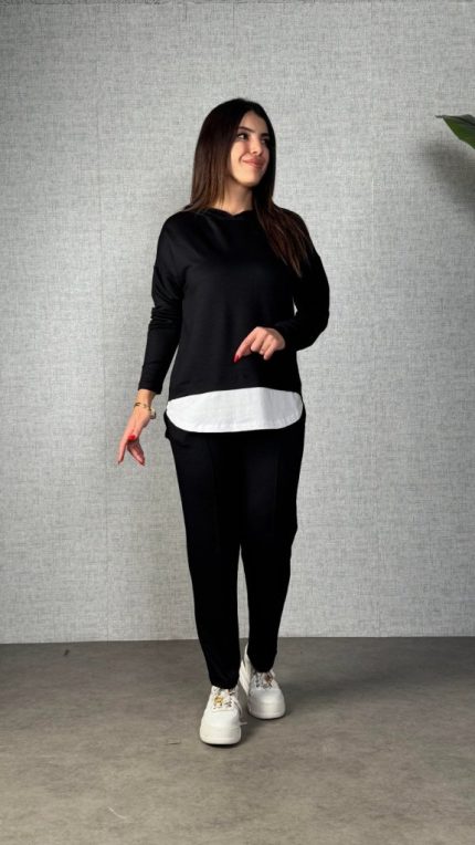 Kadın Uzun Kollu Kapşonlu Bağcıklı Viskon Iki Iplik Bluz Ve Pantolon Ikili Takım