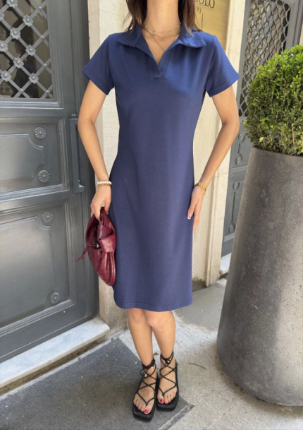 Osy Modal Yumuşak Dokulu Kumaş Yakalı Kısa Kollu Elbise – Mavi