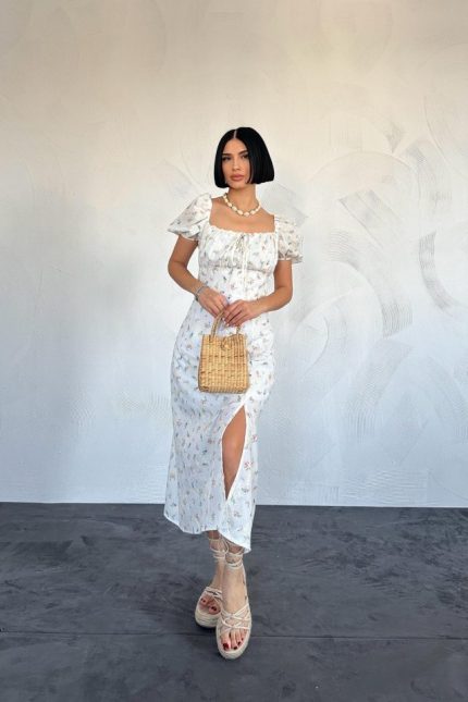 Kadın Kısa Kollu Kare Yaka Yandan Yırtmaçlı Fitilli Kaşkorse Elbise