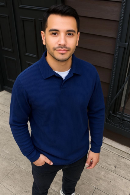 Erkek Fitilli Polar Sweatshirt – Düğmesiz Polo Yaka, Oversize Rahat Kalıp, Kalın Polar Kumaş, Kışlık Ve Baharlık Şık Günlük Üst – Lacivert