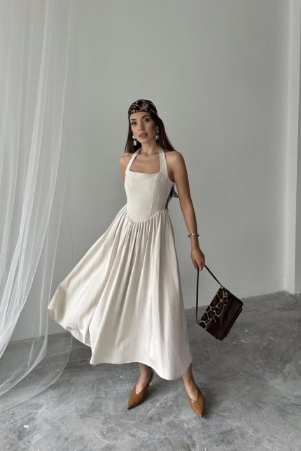 Bej Boyundan Bağlamalı Keten Elbise