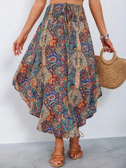 Kadın Halter Yakalı Omuzlardan Açık Kuşaklı Maksi Boy Desenli Süprem Elbise